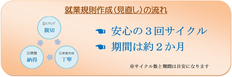 ④ ①~③の作業を約3回繰り返し就業規則等を仕上げます。期間はおよそ2か月くらいです。